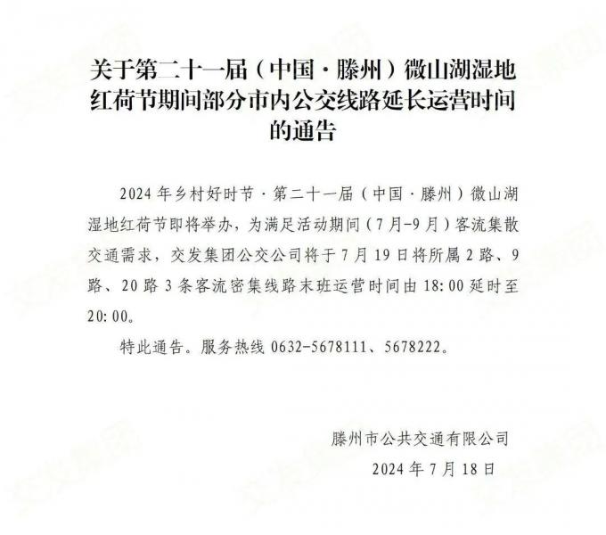 關(guān)于第二十一屆(中國·滕州)微山湖濕地紅荷節(jié)期間部分市內(nèi)公交線路延長運(yùn)營時(shí)間的通告